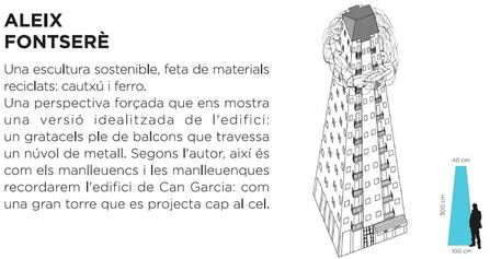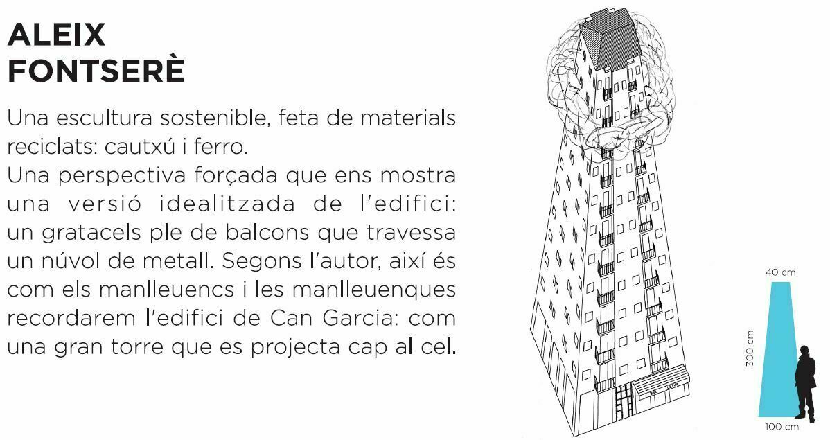 Una perspectiva forçada que ens mostra una versió idealitzada de l'edifici: un gratacels ple de balcons que travessa un núvol de metall. Segons l'autor, així és com els manlleuencs i les manlleuenques recordarem l'edifici de Can Garcia: com una gran torre que es projecta cap al cel.