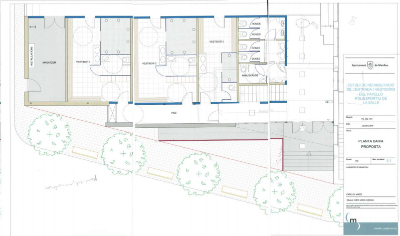 Es proposa l'enderrocament de l'estructura actual dels vestidors i la seva reposició juntament amb una remodelació de la part de l'entrada al Pavelló, edificant una primera planta sobre els vestidors que pogués ser una Sala Polivalent o un gimnàs d'accés directe des del carrer per poder ser utilitzat en actes del municipi. Se'n beneficiaran les diferents entitats esportives de Manlleu (que el fan servir de dilluns a divendres de 5 a 10 del vespre) i les persones que assiteixen a diverses activitats del municipi organitzades en cap de setmana (sobretot quan fa mal temps). Ubicació: La Salle Manlleu
